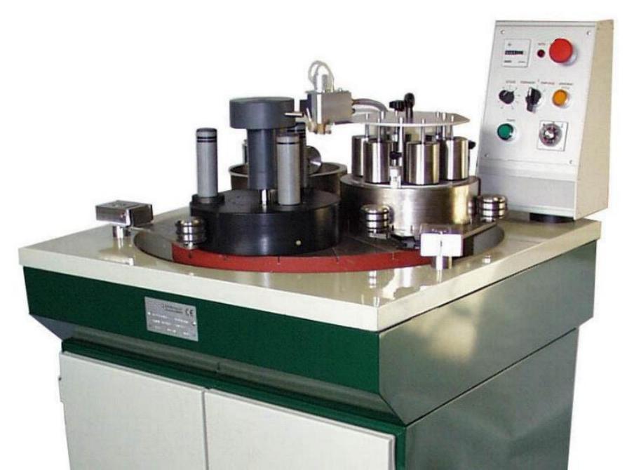 精磨机(Brot 1.03.26)由磨盘、精度控制装置、样品夹持器、碳化硅磨料和自动供料系统组成,目的是把150微米厚度的样片磨到30微米内,且具有好的平面和光洁度。磨料自动滴到转动的磨盘上,样品夹持器把样品待磨面放到磨盘上,当样品厚度磨到设定厚度时,仪器自动停止。