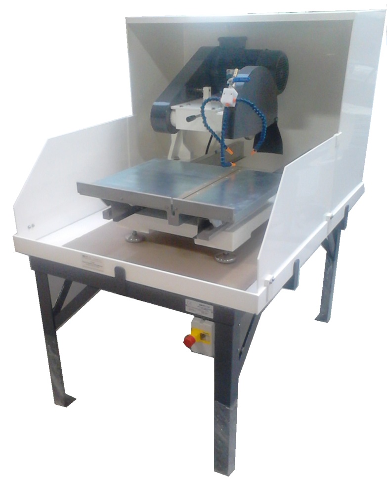 大样品切割设备主要解决大块岩样及不规则岩石切割成标准样品的问题。该机器质量非常坚固可用于切割各种矿石样品,用户根据需求从岩石中提取样品可以进行干切(利用排风管,配有除尘装置)或湿切(利用水喷头和冷却水循环容器进行)。轮轴上下范围可调节,刀片可以选择直径范围为:200~500mm,样品可以放置在有两个棱形滑板导轨并带四个铜质滚轮筒的置样模具桌面上进行移动、固定、切割。使用非常方便、安全、快捷、有效。